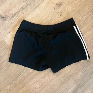 Sleek black shorts with white stripes. Ideal for sports and casual outings. Comfortable fit.