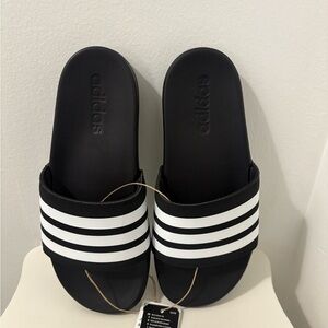 Sleek black sandals with iconic white stripes. Comfortable and stylish for any occasion.
