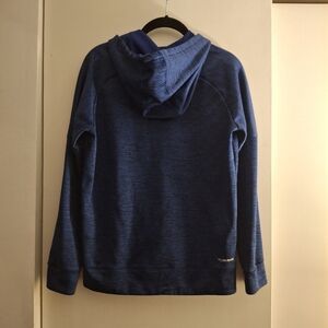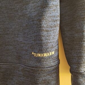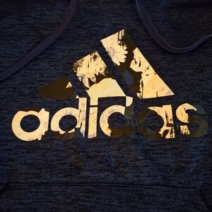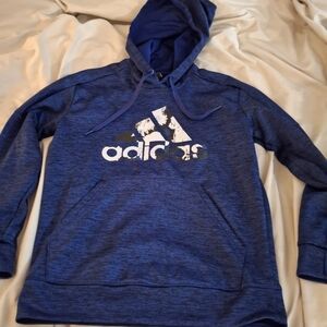 Adidas women's blue and black heathered hoodie featuring a bold logo design and front kangaroo pocket. Climawarm. Perfect for casual wear. Size medium. Pit to pit measures 20 inches. Length 26 inches.