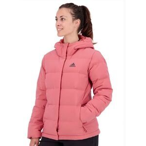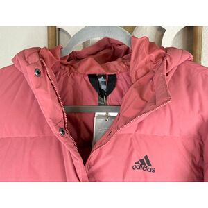 Adidas Women's Helionic Hooded Down Puffer Jacket Coat in Wonder Red (Almost a pinkish-red)