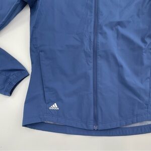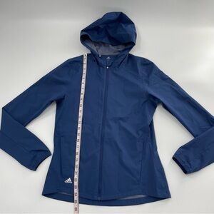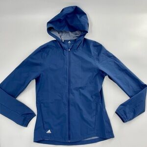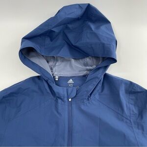 Adidas Womens Hooded Wind Rdy Windbreaker Jacket Blue Full Zip NWOT. Has zipper front two slash pockets and elastic sleeve hem. In never worn new condition.