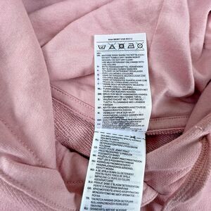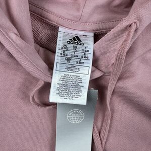This Adidas womens hoodie in a soft dusty pink offers a clean athletic look with iconic 3-stripes down the sleeves and a white embroidered logo at the chest. Relaxed fit and ultra-comfy, it's perfect for lounging, layering, or light workouts. New with tags and part of Adidas' End Plastic Waste initiative.