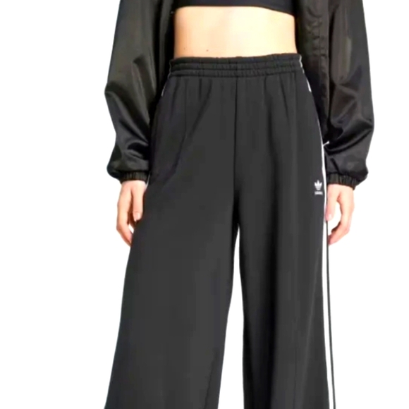 Women's pants with a wide crop leg cut for a comfort relaxed fit is loose through the legs for roomy comfort. Elastic waist for snug fit. Wide leg cut for a roomy feel Retro style achieved. Bring a vintage touch to today's streets in these adidas pants. Cut loose with elegant wide legs, they're ready to be matched with platform shoes and halter tops. Plus, they're super comfortable and made from recycled materials.