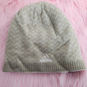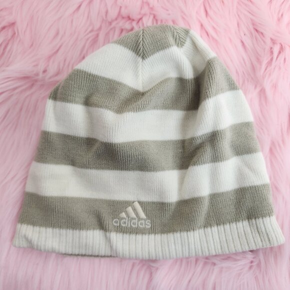 Adidas Womens OS Reversible Beanie Striped Beige White Hat Cap Climawarm