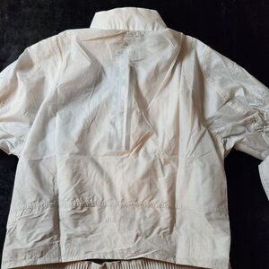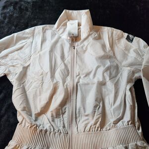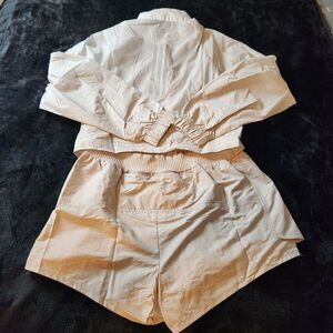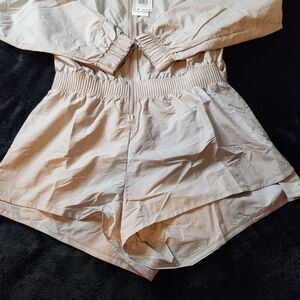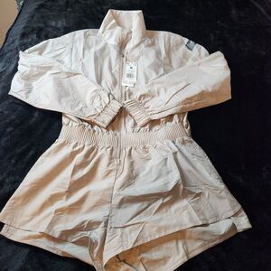 For sale is an Adidas womens Romper running jacket/shorts combo in vapour grey, size medium, 100% polyester. It is new and in excellent condition with no marks, tears or stains. It features an elastic waist with drawstring and elastic wrist cuffs. It measures 23” armpit to armpit, 26” shoulder to end of sleeve and 34.5” top of collar to bottom of crotch and 14” across the waist (stretches to 17”) and 2” inseam and 11” rise