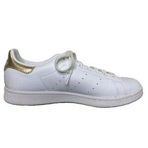 Elevate your style with these Adidas Women's Stan Smith sneakers featuring a chic white, gold metallic design and gold studs. Perfect for any casual outing, these lace-up sneakers are in excellent used condition, offering both comfort and fashion in every step. These have little to no wear. There is a small flaw on one heel (see photo).