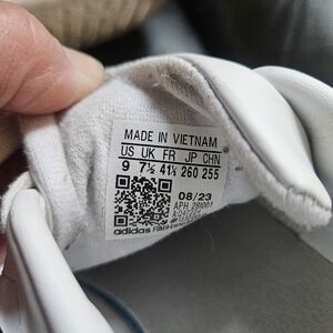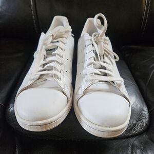 Stylish Adidas Stan Smith sneakers. White with blue heel accents. Comfortable and versatile.