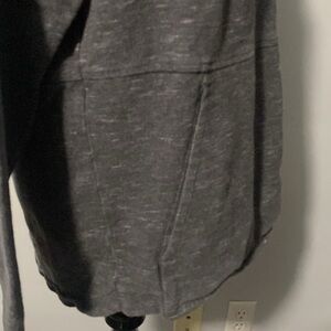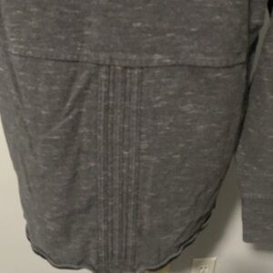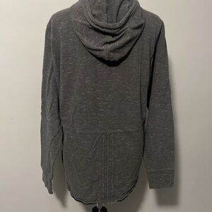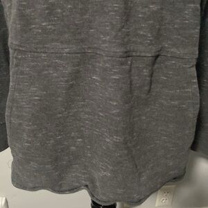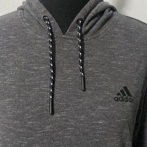 Adidas Women’s Hoodie. Dark Gray Heather with black stitching and tie. Large kangaroo pocket. No waistband. Slightly longer back. Sz L. Preowned very nice condition