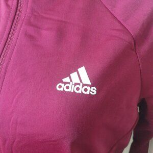 Adidas jacket, maroon track jacket, women's sportswear, 3-stripe jacket, Adidas Primegreen, zip-up jacket, medium size jacket, eco-friendly jacket, Adidas athleisure, stylish track jacket, ribbed hem jacket, track jacket with pockets, lightweight sports jacket