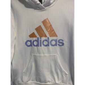 Adidas Women's White with Peach and Lilac Logo Pullover Hoodie Size Medium