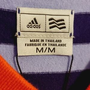 Experience the versatile nature of this Adidas Crossover Striped Sweater in the perfect blend of purple and pink, size medium. The iconic stripes along the v-neckline add classic style to your everyday closet.