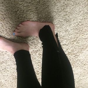 Worn a few times. Blue strips down the sides. Zipper openings at the bottom of each leg. Breathable fabric behind knee.