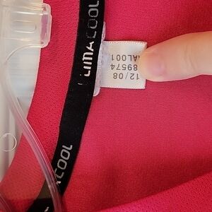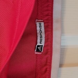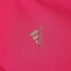 Adidas workout tee in size medium. Clima Cool fabric. Pink with white stripes and Adidas logo on the front. Some signs of wear, with small marks on the front and back. Please see pictures for details.