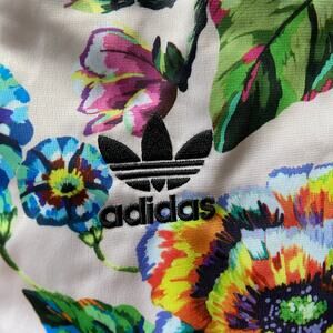 Add a vibrant touch to your wardrobe with this Adidas X Farm Rio Trefoil Floral Track Jacket! This eye-catching jacket features a beautiful floral print designed in collaboration with Farm Rio. The jacket is a size small and comes in a striking pink and black color scheme. It has a full zip closure, making it easy to layer. Perfect for workouts, casual outings, or adding a pop of color to any outfit.