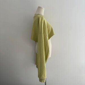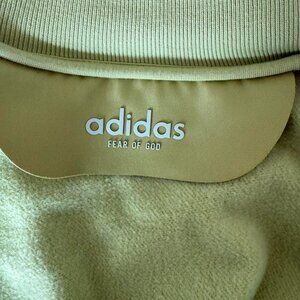 Rare adidas x Fear of God Essentials crewneck in the olive/green colorway with bold blue adidas logo across the chest. Originally released as a standard fit sweatshirt (see last photo for reference), this one has been custom cut into a cropped style for a one-of-a-kind streetwear look. Super soft fleece inside, oversized sleeves, and laid-back fit. Perfect for layering over high-waisted jeans, cargos, or joggers.