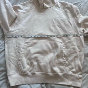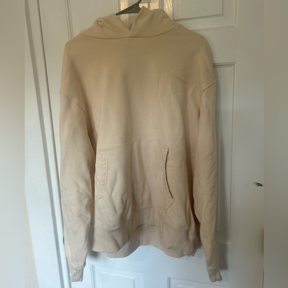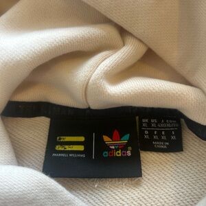 Cream hoodie featuring Pharrell Williams collaboration. Comfortable and stylish design.