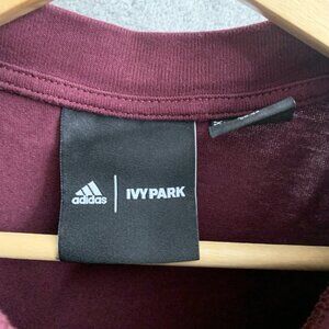 The Adidas X Ivy Park burgundy shirt is a stylish women's small-sized tee featuring a solid burgundy color and a crew neckline with a pullover closure. Made of lightweight cotton knit fabric, this oversized short sleeve t-shirt is perfect for casual occasions.