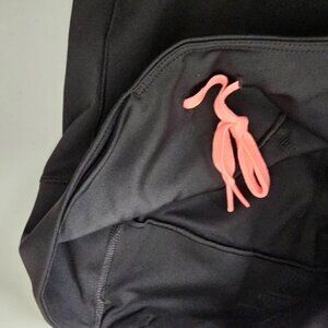 Black athletic legging. Mesh detail on the side of the legs. Reflective strips.