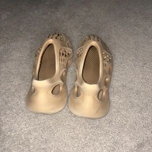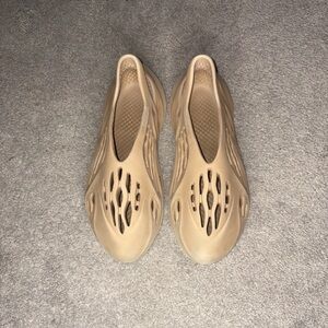 The Clay Taupe adidas Yeezy Foam RNR The upper is crafted with a smooth one-piece Primeknit material, which provides comfort, a flexible fit, and breathability. The shoe's midsole is made using adidas' proprietary EVA foam technology, providing cushioning and support. In addition, the midsole features a dynamic design with intricate textures and patterns. The shoe's outsole is crafted of durable rubber, ensuring stability and grip. The shoe also features a sock-like collar for a snug fit around the ankle.