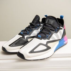 These Adidas ZX 2K Boost are a Men's sz 14 in the Pink/White/Blue colorway. These shoes are preowned in Near New condition! It looks like they may have been worn once, if at all! Great for running, daily comfort, or athletic activity!