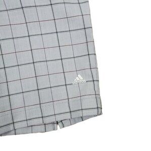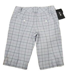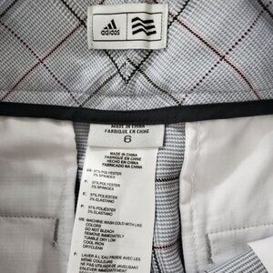Adidas active shorts. Great for golf! Stretch and open slit on the back of the knee gives these shorts extra comfort. New with tags! This plaid has black, grey and a berry stripe in it.