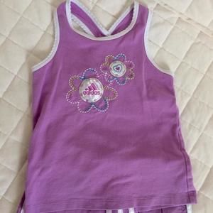 Activewear. Purple. Adidas. Girls. 2 piece set. Top & skirt bottom. Floral. Shorts. Fitness. Workout. Gym. Tennis. Tank top.