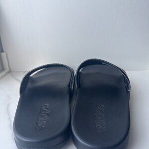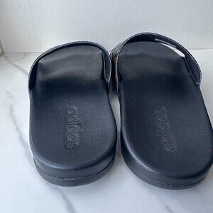 Tortoise & Black Print Comfort Slides By Adidas. Brown Muti/Tort with 3 Black Stripes, Synthetic Upper with Textile Lining, Contoured EVA Out Soles
