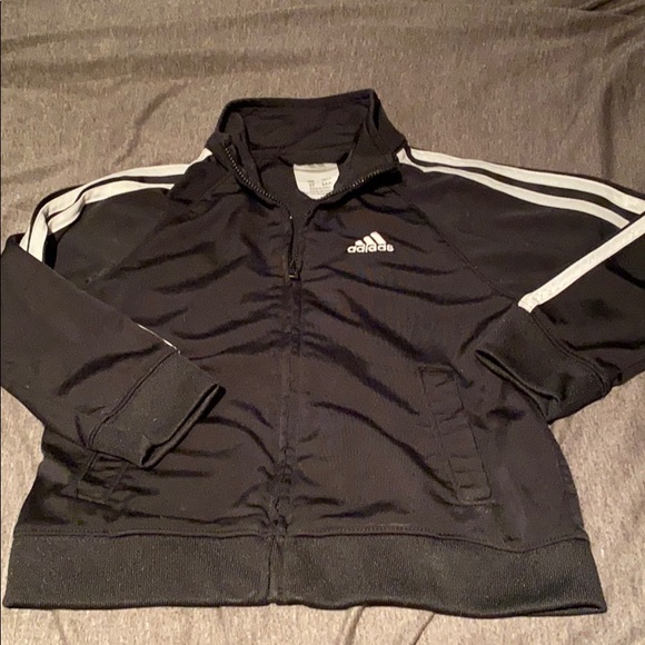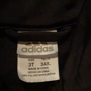 Black and white 3T Adidas three stripe zip front jacket. There is a very small amount of pilling on the left side beneath the Adidas logo shown in picture.