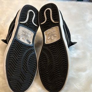 Adidas black hightops, white soles, white stitching used with minimal wear Approximate measurements: width at the widest 4” heel to toe 10” Please see photos, What You See Is What You Get All offers are welcome and pet friendly home !!