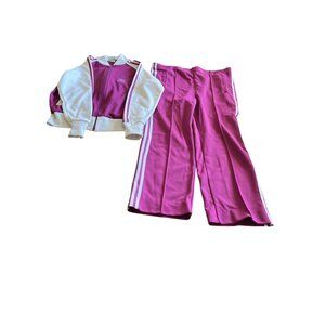 Adidas burgundy and white track suit jogging suit size Medium Large. To zips in front. Has side pockets. Ribbed elastic waist and bottoms of sleeves. Pants have elastic drawstring waist. Side zip pockets. Top is Large, pants are Medium. Care tag too faded to see. Good pre-owned condition.