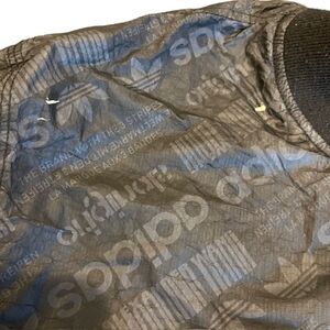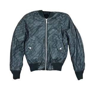 Adidas by Alexander Wang Reversible Bomber Jacket Sherpa Fleece Black Size XXS. Long sleeve reversible fleece bomber jacket in black. Rib knit stand collar, cuffs, and hem. Zip closure at front. Tonal logo embroidered at chest. Welt pockets at waist. Reverse in tonal technical poplin featuring crinkled texture and logo graphic pattern in grey. Silver-tone hardware. Tonal stitching.