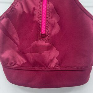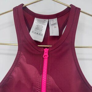 Stylish and functional Adidas by Stella McCartney high-neck sports bra in a rich burgundy color with a vibrant pink front zipper. Designed for performance and modern athleisure style, this racerback sports bra provides support with a sleek, sculpted silhouette.Size XS