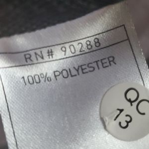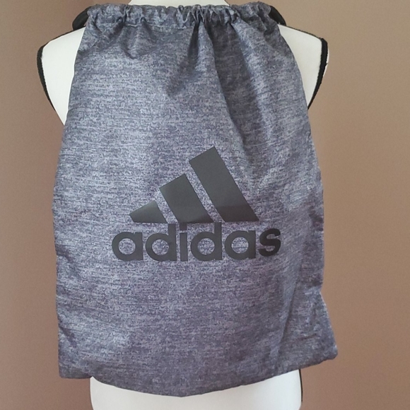 Flat drawstring backpack 19 inches high, 15 inches wide. Heather charcoal with black, rope like, drawstrings.