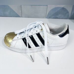Good condition Adidas gold toe superstars. Shoelaces have been replaced- I accidentally put in the silver tip ones instead of gold for photos- gold will be put in upon purchase. Can be spruced up even more with a sneaker cleaner.