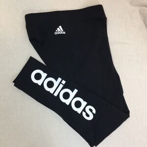 Black cotton leggings with Adidas screenprint up left leg - gently worn, no flaws - size XS