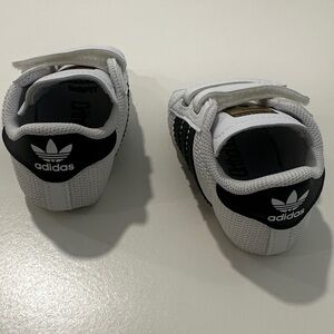 Adidas sneakers with classic black stripes. Velcro straps for easy wear. Gold accents add a touch of flair.