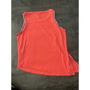 Add a pop of color to your workout wardrobe with this vibrant coral colored Adidas tank top. The tank features the iconic Adidas logo on the front and tie closures on the side for a flattering and secure fit. Perfect for any active occasion, this tank top is made for women who love to stay stylish while staying active.