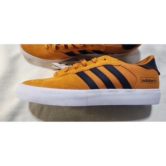 New without box, has tags. Orange shoe with blue stripes and written gold adidas on side.