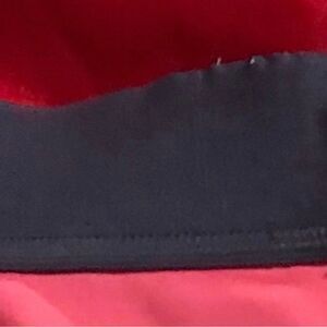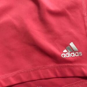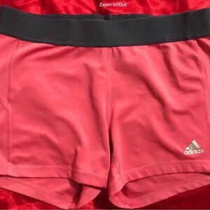 Techfit medium compression coral shorts with a black waistband. Adidas on the front hem. The waistband has a few pulled elastic threads. All of the treads are shown.size large.