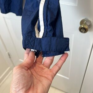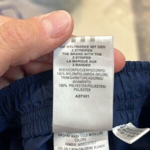 Stylish Adidas blue joggers with iconic white stripes. Perfect for active wear. Size large. These track pants are so iconic! They are from the early 2000s! They are not a sweat pant but made of a windbreaker material. Very lightweight and would be great to layer in the winter! They have side zipper on the bottom as well as Velcro. Also have a drawstring waistband. Such an epic pant to wear!