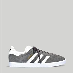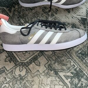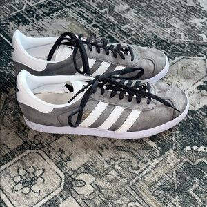 Chic Adidas sneakers in gray and white. Features black laces. Ideal for everyday style.