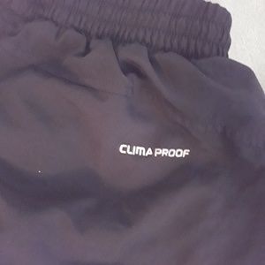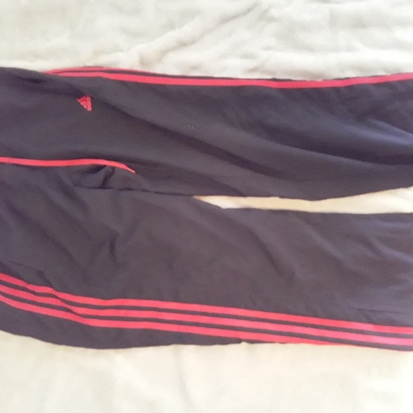 These are red and black Adidas says size small I feel they run a bit big. They are in very good used condition! They are the "swish" kind of pants? If that makes sense lol has zippers on the bottoms.
