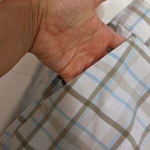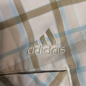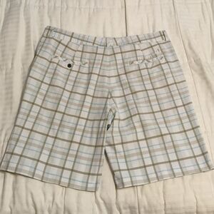 Adidas flat front plaid shorts with pockets size 38. they have a single button and zipper closure. two front pockets one buttoned back pocket and one regular back pocket lots of cute Adidas details. the waist measures 19 in the rise measures 12 in and the inseam measures 10 in. these are nice and lightweight.