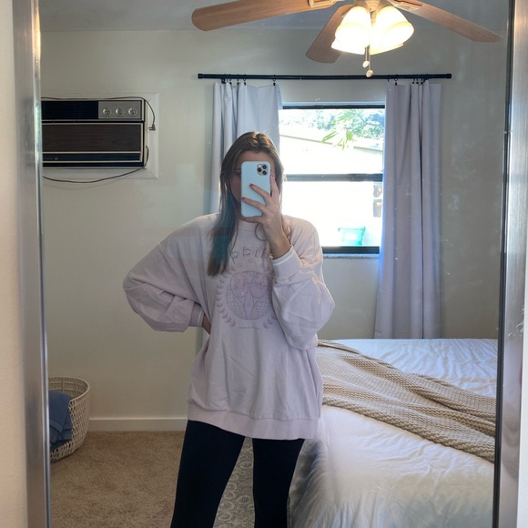 This is a lilac adidas pullover that features sporty wrist cuffs and cool design in the center. It is a thinner material. It has no stains and no signs of wear.