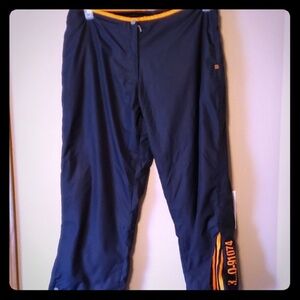 Size large missing the tag windbreaker style quick dry capris blue and orange with snaps at calf and tre foil hidden in snapped area so when unsnapped you see the orange stripes pockects zipper snap front no elastic