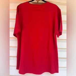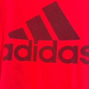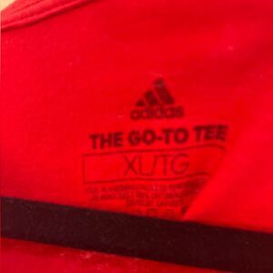 The Adidas shirt is a vibrant rich red short-sleeved top with a classic crew neck design. It features the iconic Adidas logo on the chest, adding a touch of brand recognition. This shirt is a size XL/TG, offering a comfortable and relaxed fit.