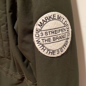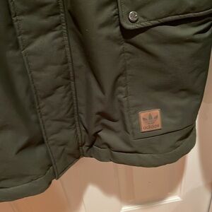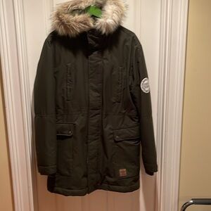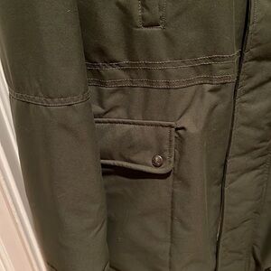 Great coat has camouflage on the inside. Has hood the fur comes off or on. Great deep pockets. Looks new. Will keep you so warm. Hunter green color
