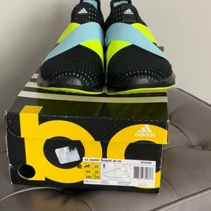 Adidas sonic boost sneaker, size 10.5. Black with bright green and blue stripe. Excellent condition. Only worn a few times. Has partial boost, rare, retired style and color. Only one left.