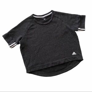 Adidas black branded short-sleeve pullover three-stripe sweatshirt. Crew neck, three stripes under arms, logo at left hem. Hem is slightly lower in the back. Heathered black (white flecks/specks). A great athleisure piece, and perfect for layering. Excellent used condition: no stains, holes, or pills.