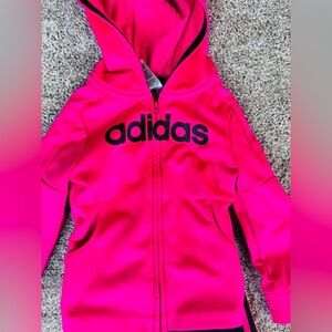 Super cute adidas tracksuit. Hot pink and black. The jacket is a hoodie that fully zips and the pants are joggers. Very good condition! size 2T